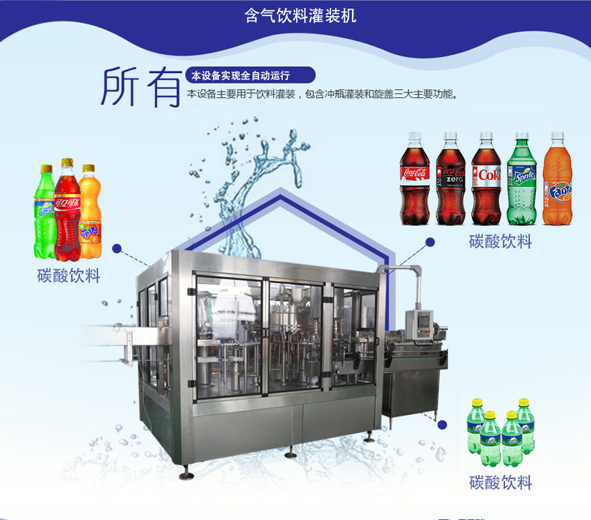 含二氧化碳飲料灌裝,包括含汽果汁、可樂、雪碧、含汽礦泉水、格瓦斯、啤酒等。