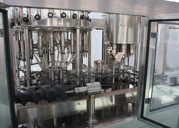 玻璃瓶灌裝機集沖洗、灌裝、旋蓋于一體,全過程自動化運行,主要適用玻璃瓶礦泉水、玻璃瓶果汁、各種玻璃瓶酒類及各種玻璃瓶調味品等不含氣產(chǎn)品的沖瓶、灌裝、封口連續(xù)。本機大部分電器系統(tǒng)零件均采用國外較好產(chǎn)品,所有與液料接觸的地方均采用優(yōu)質的不銹鋼材料制作,主關鍵部件采用數(shù)控機床精密加工, 整機光電檢測各部件的運行狀況,無瓶不灌裝,無瓶不送蓋,自動化程度高,操作簡易,具有耐磨、穩(wěn)定、故障率低等特點,產(chǎn)品質量處于行業(yè)前列,是新老飲料投資者的理想選擇。