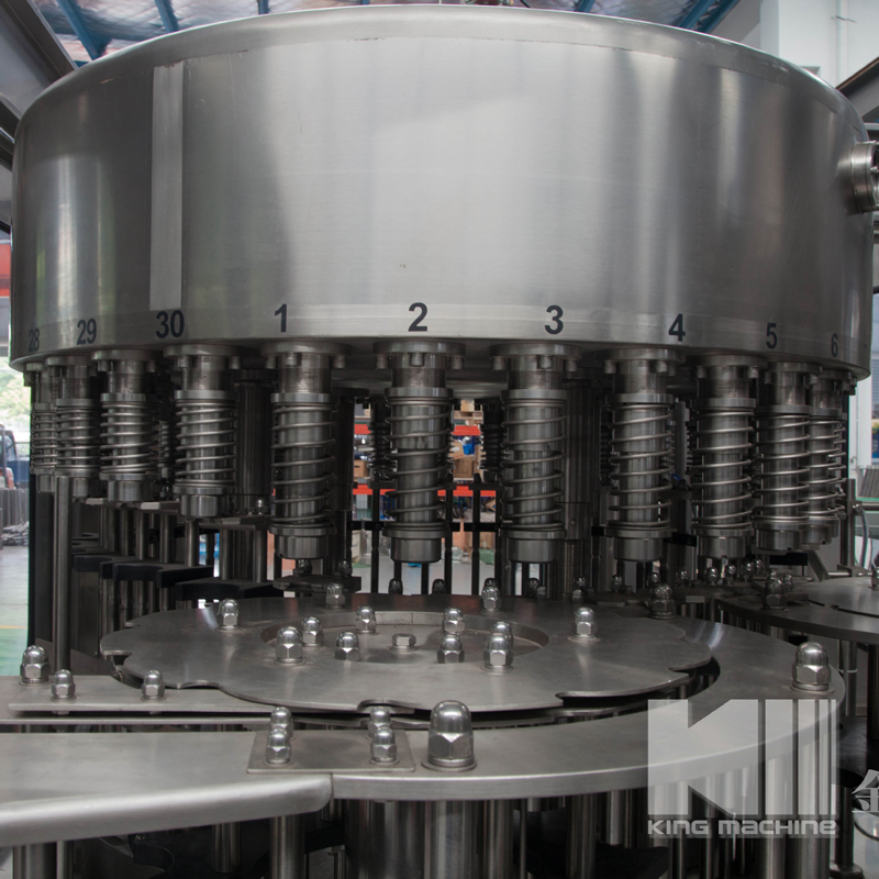 飲用水灌裝機(jī)集沖洗、灌裝、旋蓋于一體,全過程自動(dòng)化運(yùn)行,主要適用礦泉水、純凈水等不含氣飲料的沖瓶、灌裝、封口連續(xù)作業(yè)。本機(jī)大部分電器系統(tǒng)零件均采用國外較好產(chǎn)品,所有與液料接觸的地方均采用優(yōu)質(zhì)的不銹鋼材料制作,主關(guān)鍵部件采用數(shù)控機(jī)床精密加工, 整機(jī)光電檢測(cè)各部件的運(yùn)行狀況,無瓶不灌裝,無瓶不送蓋,自動(dòng)化程度高,操作簡易,具有耐磨、穩(wěn)定、故障率低等特點(diǎn),產(chǎn)品質(zhì)量處于行業(yè)前列,是新老飲料投資者的理想選擇。